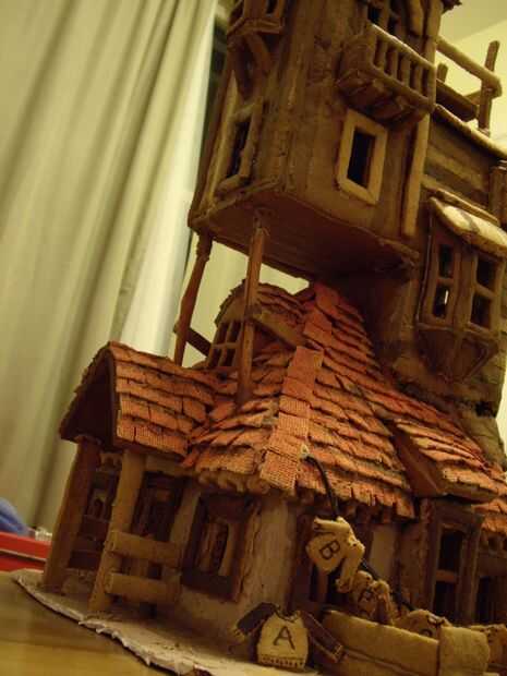 Una vez que las secciones de la parte inferior y superior fueron seco y fue la primera azotea, dispuesto a poner "superior" e "inferior" juntos. Si se puede ver en la imagen, hay canela, sosteniendo el extremo delantero de la casa. La canela va a través de un agujero en la sección delantera de la azotea para que ellos toquen la base. Quería ser muy cuidadoso en la distribución de peso ya que estaba muy preocupado, que todo se desmoronaría. Resulta que, una vez que había pegado a la parte superior de la sección inferior hubo tanta superficie cubierta que el peso no era un problema en absoluto, apenas peso realmente sentado en las ramas de canela, todas de alguna manera por arte de magia funcionó! Que es grande porque después de pasar la cantidad de tiempo que tenía que llegar a ese punto, estaba muy preocupada todo se derrumbaría. Por suerte para mí, les fue asombroso!
