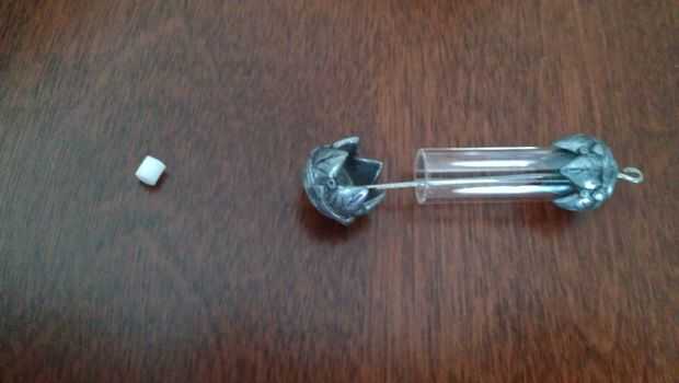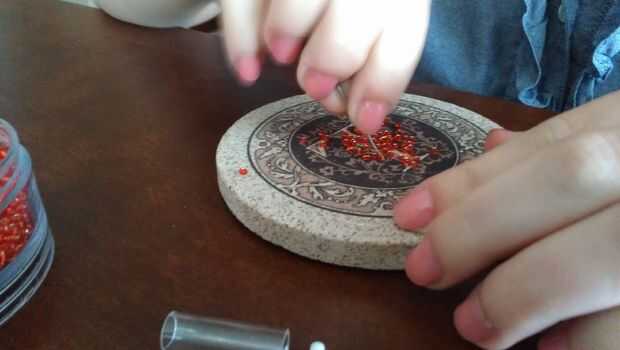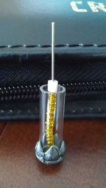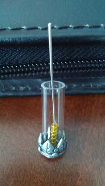 Ahora empezar a poner rocallas en el hilo. Usted querrá hacer esto antes de llenar el tubo de vidrio porque ambos hace el colgante como tiene más granos y esconde el cable. Es en realidad una de las partes más difíciles puesto que los granos de la semilla son tan diminutos; encontramos que separarse hacia fuera y empujando desde arriba trabajado mejor (ver tercera imagen). Cuando tienes suficientes granos para cubrir el cable hasta la parte superior de la botella de vidrio, vuelva a colocar otra pendiente final para no caerse durante el siguiente paso (ver la cuarta foto).