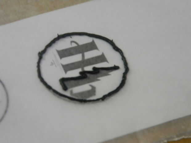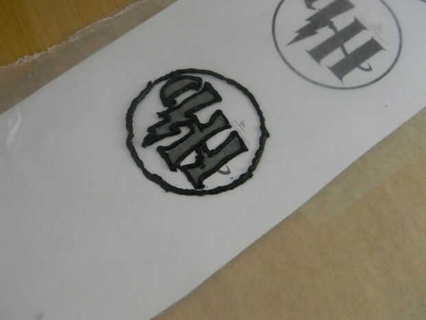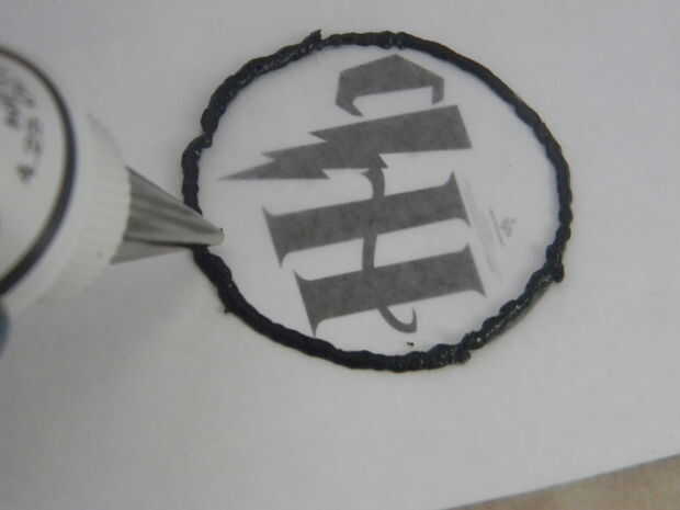 Conecte la punta de Wilton # 2 al glaseado de la decoradora Wilton negro y el contorno de la plantilla de la pipa. Asegúrese de trabajar lenta y suavemente.