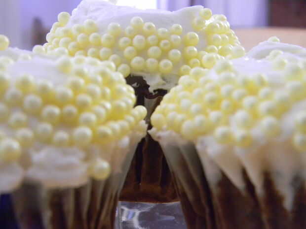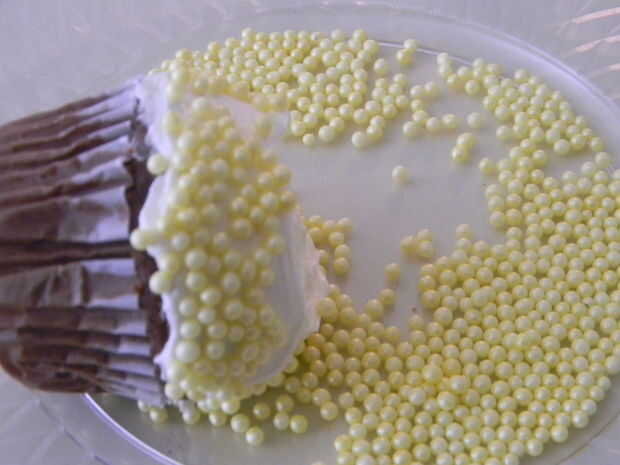 Espolvorear las perlas de azúcar de Wilton en el borde de la Magdalena para agregar brillo.