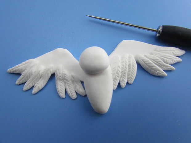 Hacer las plumas haciendo formas ovaladas con extremo cónico y coloque en la parte inferior de las alas. Para la segunda capa superior, hacer las plumas un poco más pequeña. Utilizar una herramienta de la aguja para la textura de cada pluma. Conecte 2 cables largos de arcilla para la parte superior de cada ala y luego arrastre la arcilla hacia abajo utilizando una herramienta de la paleta para crear las plumas más pequeñas. La cola también se hace la misma manera pero con sólo cuatro plumas.