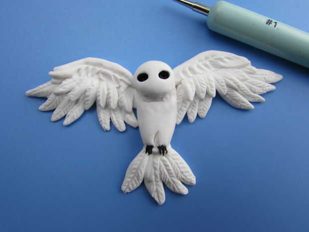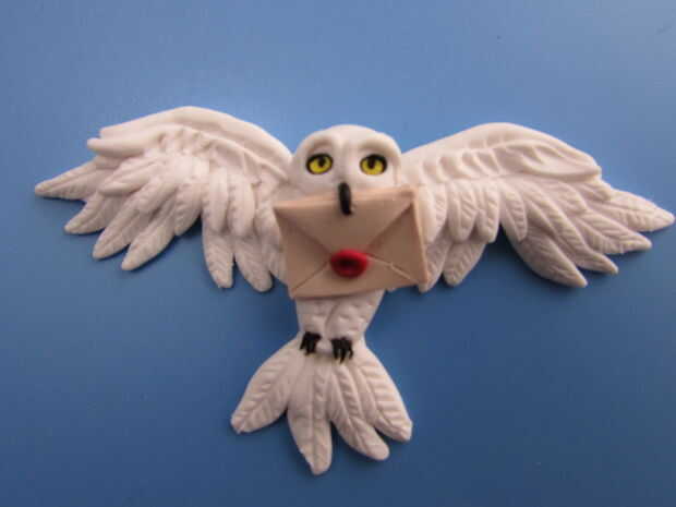 Carta de Harry, cortar un trozo rectangular y triangular de arcilla crema con un cuchillo y colocar en el cuerpo. Hacer el sello con un trozo de arcilla roja con sangría con un bolillo en el centro. Poner una corta cuerda delgada de barro negro en la cima de la envoltura para el pico.