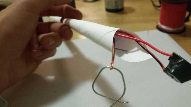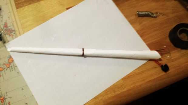 Ahora que conoces tu circuito está trabajando es la hora de hacer que el cuerpo de la varilla. Vamos a rodar una hoja de papel alrededor de su circuito y péguelo en su lugar. Rodillo, comience con una hoja de papel colocan acostadas sobre la mesa con una de las esquinas del papel cerca de usted. Coloque el LED por lo que va a terminar cerca de la punta de su varita. La mitad de batería y clip acabar saliendo de la parte posterior de la varilla.