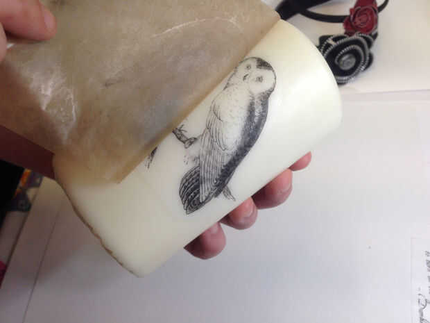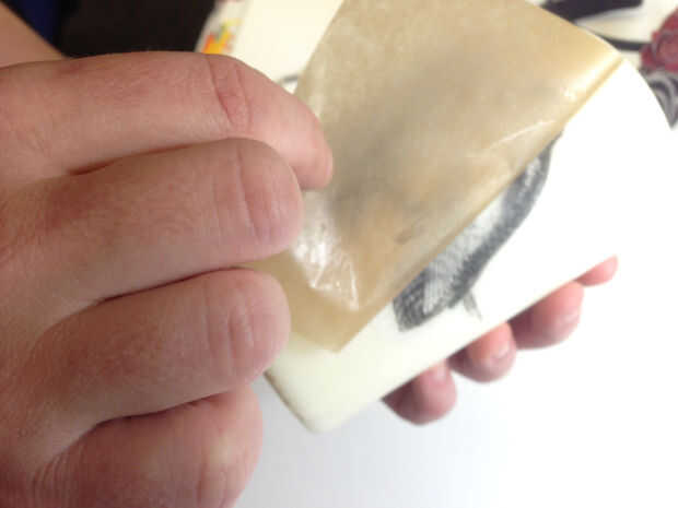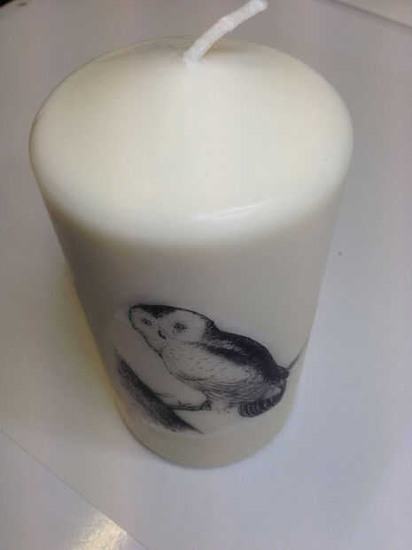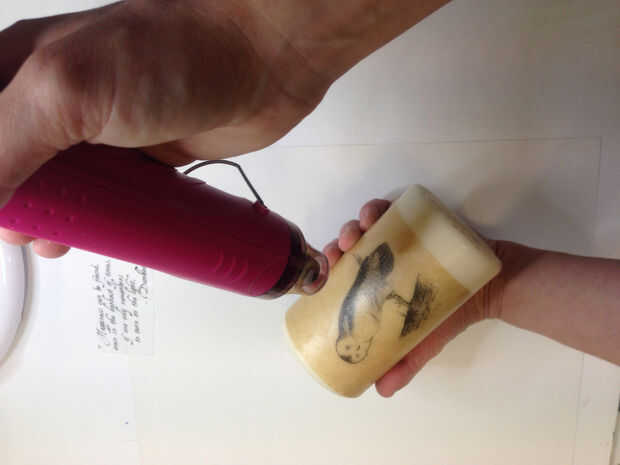 Corte un pedazo de papel encerado para llegar a alrededor de la circunferencia de la vela, cubriendo completamente el gráfico de papel. Coloque el papel sobre la vela, cubrirlo con el papel encerado y estirar estirado en la parte posterior de la vela para que tanto en posición plana contra la superficie. Manteniendo el papel de cera desde tan lejos como sea posible, use la pistola de aire caliente para calentar para arriba. Trabajar rápidamente y mantener la pistola en movimiento: el objetivo es derretir la cera en el papel de cera para que empapa el papel y adhiere a la vela, pero no derrite la vela sí mismo. El papel encerado se volverá brillante y se verá el color del pañuelo de papel debajo de cambio un poco cuando se hace.