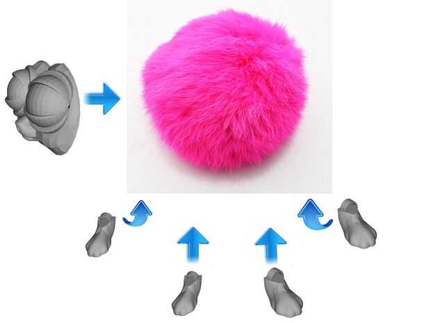 Existen ganchos en las piernas y la parte posterior de la cabeza. Las partes pueden fijarse en el furball con hilo por el gancho. Puesto que el gancho es frágil, se recomienda utilizar pegamento caliente también. Esto les fijarán en la posición correcta.
