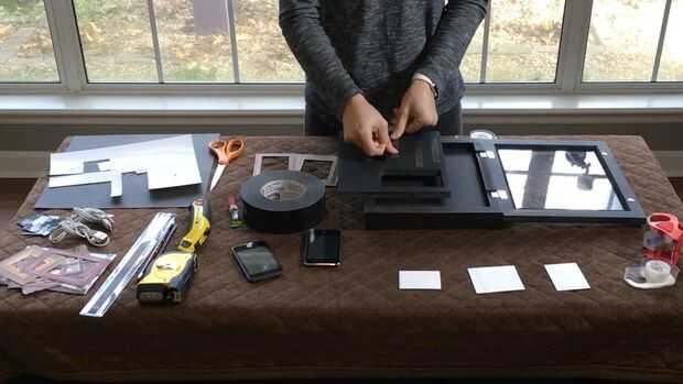 Usé cinta de doble cara para fijar el tablero de la espuma, las fotos y los dos pedazos de tablero de la espuma junto a la caja de la sombra.