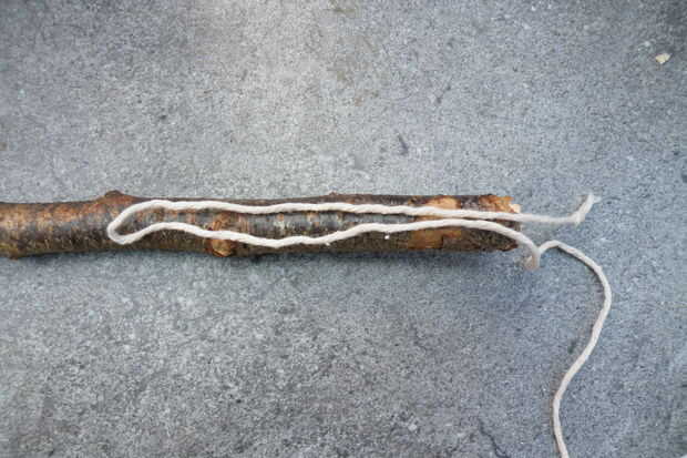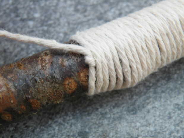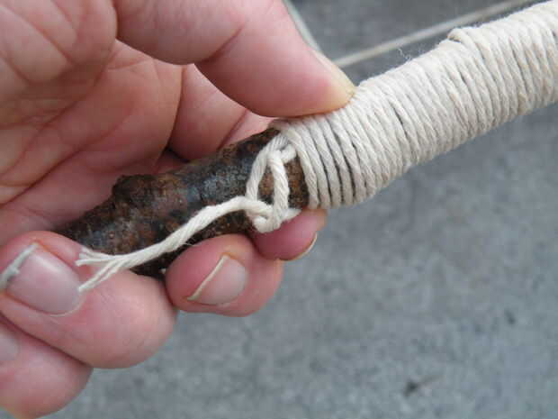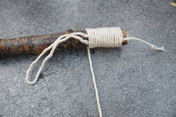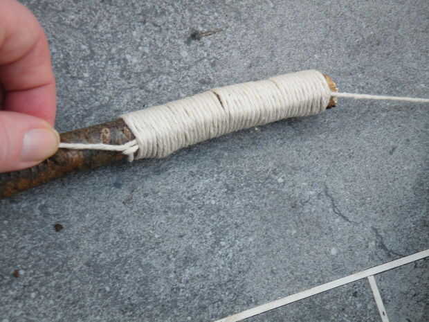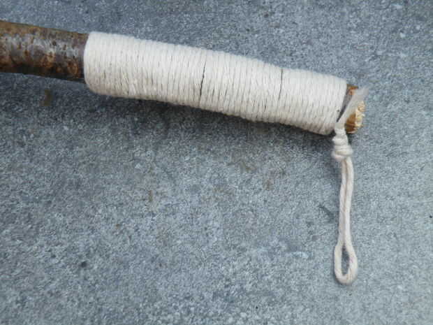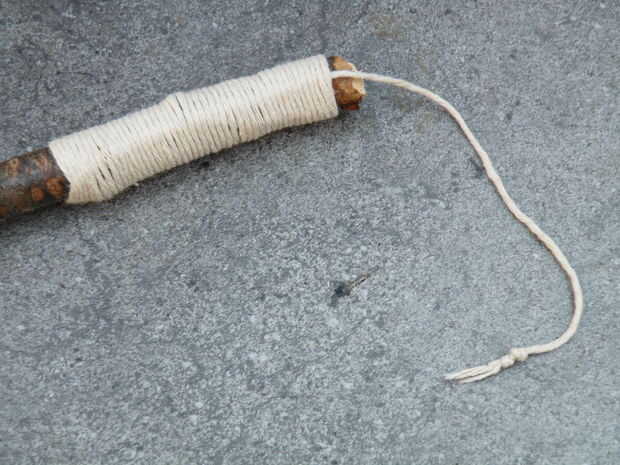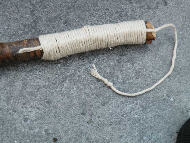 - Tome el extremo más largo y empezar a envolver firmemente alrededor de la varilla y el extremo corto. Usted debe dejar parte del extremo corto sobresale, o los azotes fallará.