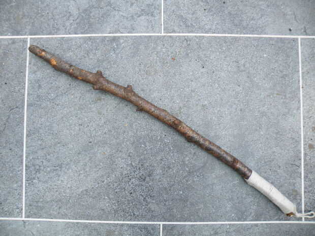 - Pone el lazo a lo largo de la empuñadura de la varita, con la curva del bucle apuntando hacia la punta de la varita y los dos extremos colgando hacia abajo. Puede utilizar cinta adhesiva para mantener la cadena en su lugar, pero no es vital.