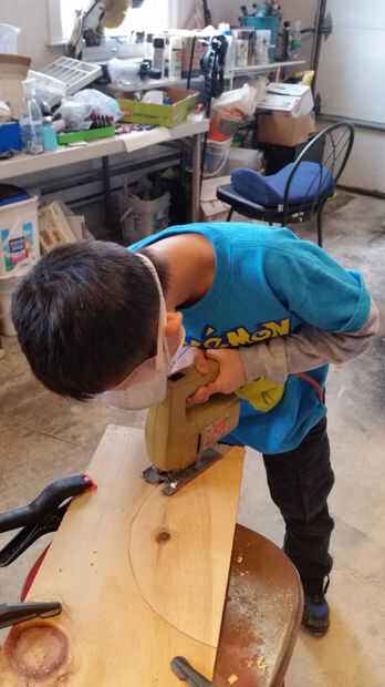 Empezamos un corte con una sierra de marquetería (pero no tienes que) luego con una sierra de calar eléctrica, corte alrededor del semicírculo con mucho cuidado. Sugiero adultos hacen esto con su hijo o por lo menos aferrarse u otros dedos y la mano de la cuchilla móvil. En caso de que usted estaba interesado, desconectado la sierra para esta foto, por eso el cable está en el bolsillo.