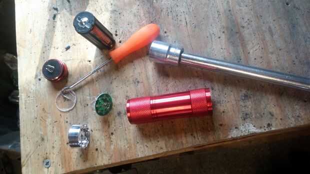 Retire la batería y el botón si no lo agarra un zócalo de 16mm y una extensión y presione el LED hacia fuera, separador de basura plástico llevó.