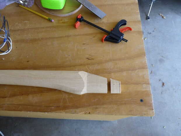 - Corte aproximadamente 1" desde el extremo de la manija como se muestra en la segunda foto. Quitando esto poco le permitirá más espacio para el eje de cola más en la base y es demasiado flaco para que se fije a la base de todos modos.