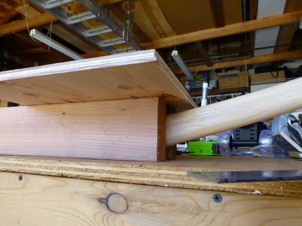 - Deslice la manija hacia adelante/hacia atrás hasta que haya un pequeño espacio (aproximadamente 1/4") entre la parte superior del mango del hacha y parte inferior del tablero del asiento, como se muestra en la cuarta foto. La diferencia será muy útil más adelante, cuando se necesita deslizar el bateo de algodón y la tela para el cojín del asiento entre el mango y la Junta de asiento