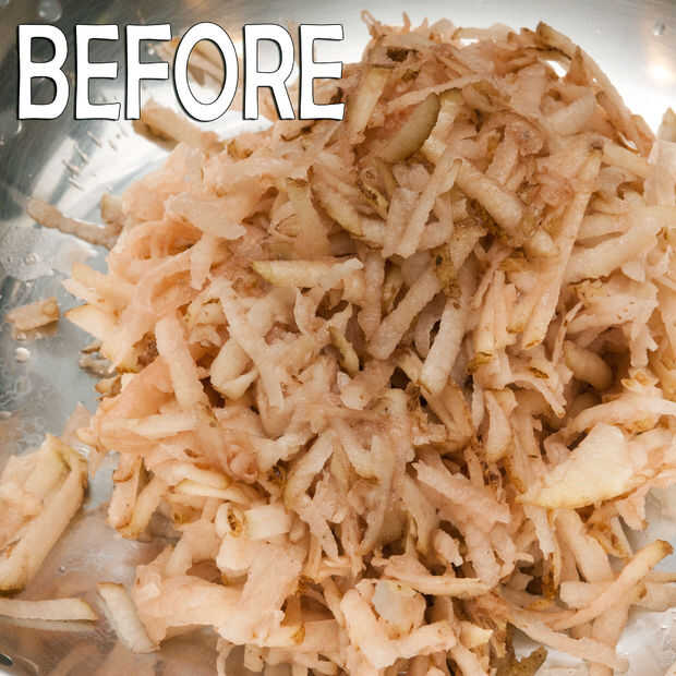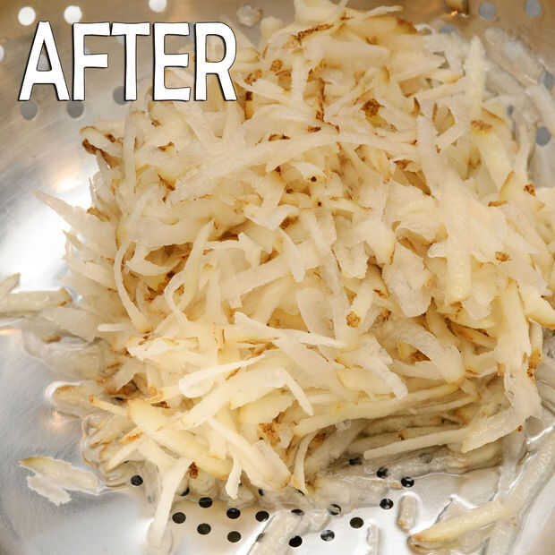 Esto es donde la magia sucede. Al hacer esto, usted verá sus fragmentos gire de una masa gris, blanda en trozos crujientes, blancos de la bondad de patatas delicioso. Según el internet (siempre fiable), va a quitar "los almidones" en este paso. No sé por qué esto hace la diferencia, pero seguro que sí. Toda la diferencia.