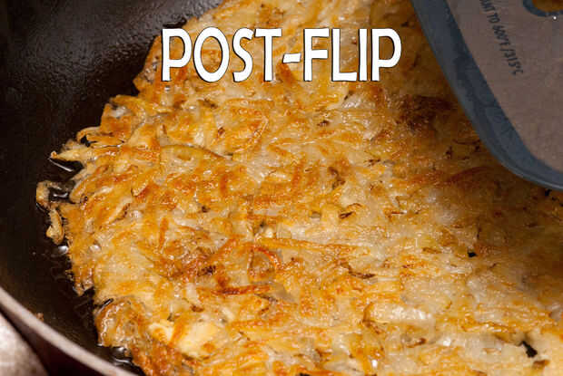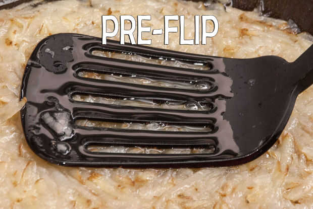 Añadir la patata y embalar en una empanada (véase abajo para el grueso). Busque hacer-ness en la parte inferior antes de los bancos. Probablemente tardará alrededor de 5 minutos por cada lado. Trate de voltear sólo una vez. Si el picadillo está a punto de desmoronarse, que está muy bien: sólo tirón en pedazos.