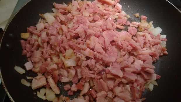 Mientras te sauteeing tu cebolla, picar o dados alrededor de dos tazas de jamón y luego añade a la sartén con la cebolla.