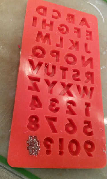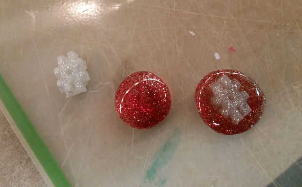 A continuación, exprima un pegote de pegamento en un color de brillo contraste sobre su hoja de silicona. Usé un centavo por debajo de la alfombra como una guía. Usted debe contar cuántas bombas de pegamento caliente se utiliza para realizar el círculo porque se quiere recrear un círculo idéntico para el otro pendiente.