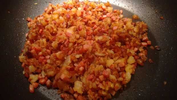 Cuando las papas estén bastante marrón, añadir tus dados de jamón y tocino y continua revolviendo hasta que se dore el jamón. Nos gusta mantener cosas sobre fuego medio-bajo hasta que comienza literalmente reventar.