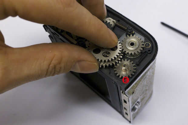 Deslice el engranaje de resorte a su lavadora (disco negro thingy en la siguiente foto). Utiliza un movimiento oscilante suave cuando lo deslice en su lugar, todo el camino. La lavadora tiene una pequeña parada que el resorte se captura una vez en lugar, permitiendo que el resorte al ser tensada. Una vez en el lugar, la tensión el resorte girando el engranaje (no recuerdo la dirección, pero es obvio que el resorte solamente las tensiones de una manera) y se mantiene en su lugar mientras el engranaje grande (uno en la imagen anterior). Probablemente hay mucha tensión y muy poca tensión aquí, y no tengo ni idea de lo que recomienda Hasselblad. La tensión algo así como 1.5 o 2 vueltas completas, que trabajó para mí. Demasiada tensión y el nylon se desgastarán. Demasiado poca tensión y el engranaje grande (que interconecta a la liquidación de la cámara) no brotará en su posición correcta.