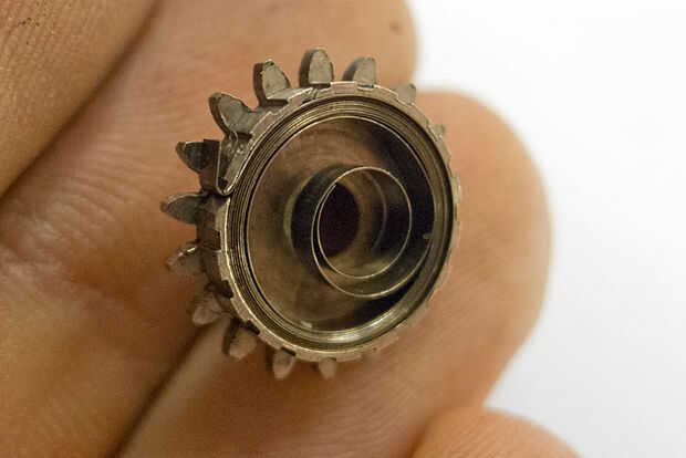 Trate de no sacar el engranaje en la parte inferior derecha (E), o estás en para una sorpresa: la corona es resorte debajo. Utilice un destornillador pequeño o similar para celebrar la primavera en el engranaje como lentamente retirar el engranaje. Si usted no toma gran cuidado al quitar ese engranaje (F en la imagen anterior), la primavera pop out con (SPROINGGG.) y enreda a sí mismo. No es ningún desastre Si saltara, pero significa que usted tiene que gastar más tiempo y paciencia para desenredarlo y vuelva a instalarlo en el equipo. No es difícil: poner el "gancho" de resorte en la ranura (como se ve arriba) y suavemente enrolle el sping hacia atrás mientras gira el engranaje.