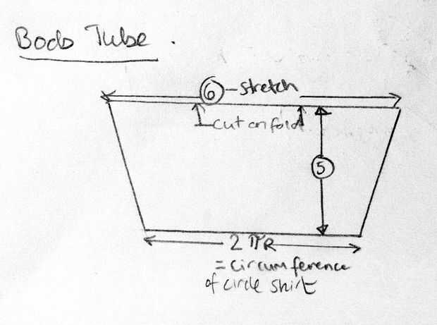 Su tonta pieza debe ser una forma de "TRAPECIO". En primer lugar, procede la medida de longitud (6).-esta medida será necesario alterar para el estiramiento, pero sólo por unos pocos centímetros. Dividir su medida boob por medio va a terminar en apretujados pechos (esto me pasó la primera vez que he probado!). Ser generosos para evitar este problema. Si el tubo termina siendo demasiado flojo, se puede fácilmente tomar la costura posterior que haremos más adelante...