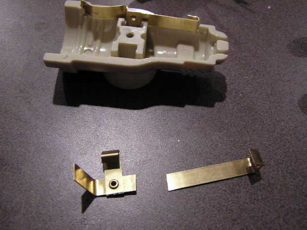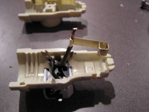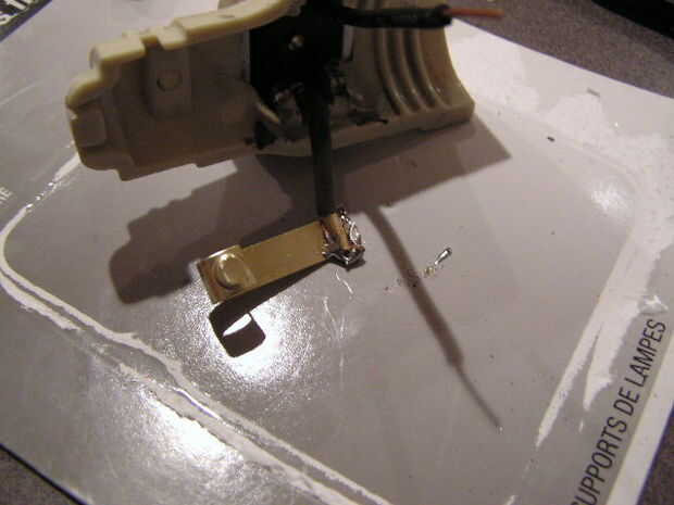 Cerca el remache del conductor caliente, cortar el conductor. En orden para la parte inferior la mitad del caliente conductor a permanecer en el lugar de la U en forma final debe doblar una vez más para formar un cuadrado. Además hice un enrollamiento apretado en el otro extremo del cable que viene de la toma de corriente de arranque. Después de insertar el cable en el enrollamiento, agregué algunos soldadura para hacer el alambre un poco más rígido. Dio el conductor de una pequeña curva para mantener cerca de la pared de la carcasa de plástico (veremos esto en una foto más adelante) usando el remache en la mitad superior de mi conductor caliente como punto de conexión, se deslizó el cable negro 18AWG por el remache y doblar el alambre alrededor del conductor.
