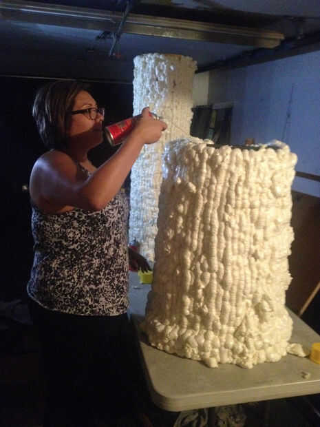 Lo que hicimos a partir fue tomar una basura puede y un montón de "cosas grandes" espuma del aerosol y acaba de hacer líneas verticales alrededor del tronco. Luego hizo lo mismo con uno de esos tubos de cartón que Quikrete hace para que sea más alto.