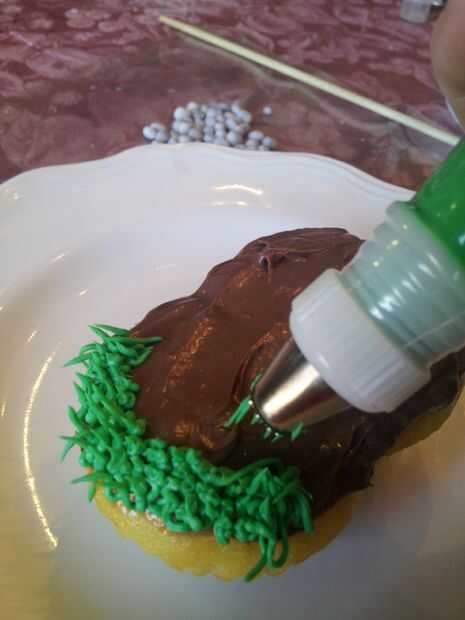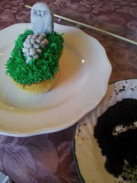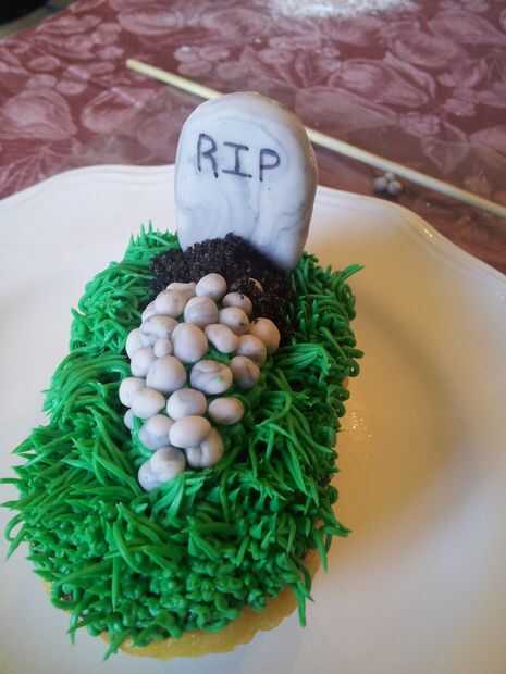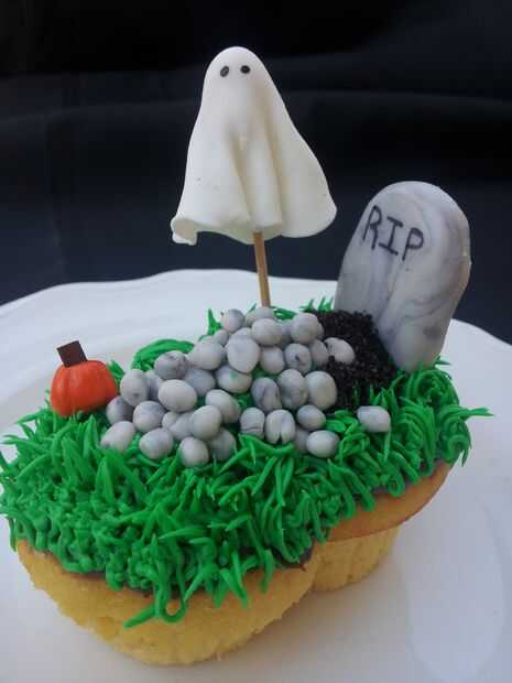 Teñir el glaseado verde y preparar una manga pastelera con la punta de la hierba # 233. Asegúrese de cubrir bien los lados. Coloque la piedra de cabeza. En el medio donde fue enterrado el "cuerpo", tubo un montículo. Cubra el montículo con las pequeñas rocas que hecho. Añadir con cuidado un poquito de 'dirt' hacia la piedra de cabeza. Esto es donde el fantasma se escapó. ; ) Ahora sólo tiene que añadir a su espíritu poco lindo.