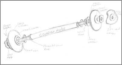 Pegue una tuerca en la arandela de la tarjeta de regalo de lámpara (ver construcción de abajo), deje secar y luego enrosque la arandela de la tarjeta de regalo en un extremo de la Asamblea de axel y apriete
