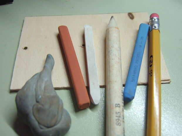 Tiza pastel (varios tonos diferentes de marrón, azul, blanco)