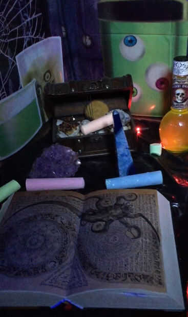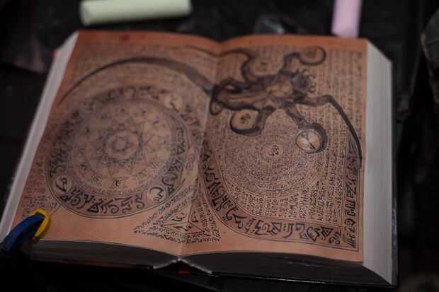 Preparación: Encontrar un libro lo suficientemente grueso que es digno de destrucción (en mi caso "Das Buch" de Wolfgang Hohlbein). Abra el libro a la mitad y fijarlo con la abrazadera hacia abajo firmemente. Buscar en internet para la página de un libro lo suficientemente creepy (he encontrado mina en pinterest) y modificar según sea necesario (he añadido la clave imágenes prediseñadas). Imprimir página y mantenerla hasta el libro abierto para que puedas hacer las marcas donde el botón se tiene que ir.