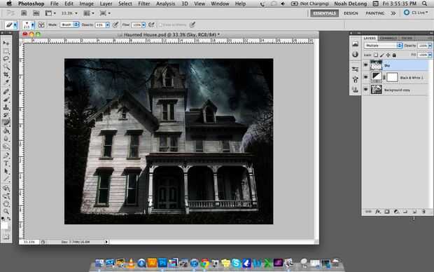 4. Utilice un borrador suave para borrar las áreas donde el cielo superpone a la casa.