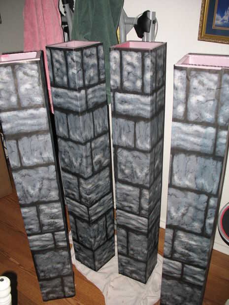 Cortar cada hoja de 8'x 4' de espuma del aislamiento en tiras de 12 - 6 "x 4'. Luego pegué cada lado como se muestra. Utilicé cinta adhesiva para unir cada pilar como el pegamento secado. Tardó aproximadamente unos 3 días totalmente secos. Usé un pegamento para madera en la primera, pero que pegamento no tratar cerca de tan rápido como se necesitaba, por lo que se trasladaron a pegamento pegajoso, que funcionaba increíblemente bien. Una vez que seco, utilicé la madera pegamento para pegamento cada sección del compositor escena piedra a los pilares de la espuma. El pegamento de madera era lo suficientemente pegajoso para mantener el envoltorio plástico de la espuma, pero slick lo suficiente como para cambiarlo cuando sea necesario antes de seque totalmente. Una vez que los secos, corté 8.5" plazas fuera de las restantes hojas de espuma (solo hice 10 pilares, y tuve 2 hojas más que quedaron todo). Spray pintado un plano negro. Un Consejo... Si consigues la pintura en aerosol cerca de la espuma, la pintura de aerosol se comen lentamente en la espuma y hará que se vea más realista como se seca. Una vez que eran secas, simplemente usé el mismo Taky cola a cola las tapas en.