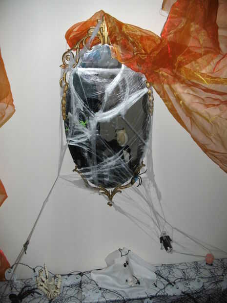 el LASER Maze fue nuestra transformación y Arduino powered casa embrujada garaje para 2011. Un monitor se encuentra fuera de la cochera, mostrando "PRESS START". Después de presiona el botón, un video intro juegos que instruye a esquivar los ray