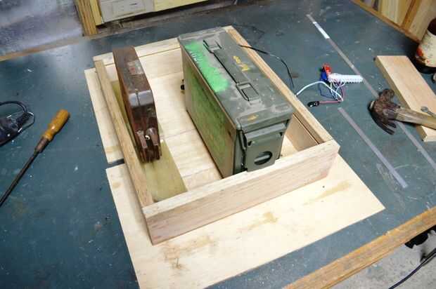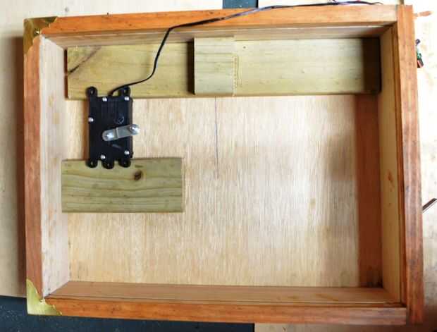 4. pegamento abajo un par de piezas de desecho de madera para montar el motor encendido y también añadir una pieza a lo largo de uno de los lados largos de la caja. Además de esto, otro pedazo de madera del pegamento pero hacerlo unos 40 mm de ancho. Esto es donde se sujetará el brazo principal para.