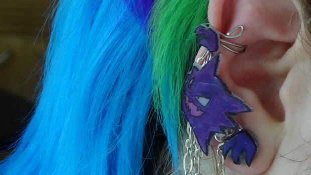 Con mi amor Haunter me puse a diseñar un pendiente. El pendiente de la anterior tiene un manguito del oído con una de las manos de Haunter, su cuerpo colgando en el centro de la cadena de plata y luego un perno en la parte inferior sosteniendo otra mano de Haunter. Lleva a la gente un poco más para obtener el pendiente pero consiguen realmente felices una vez que haga clic.