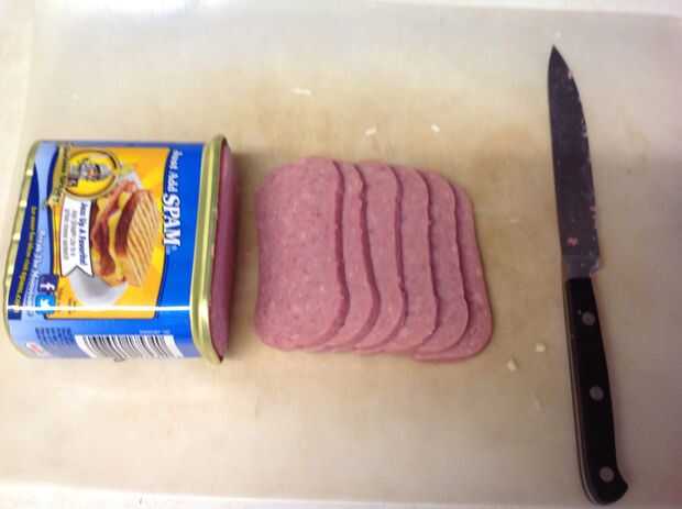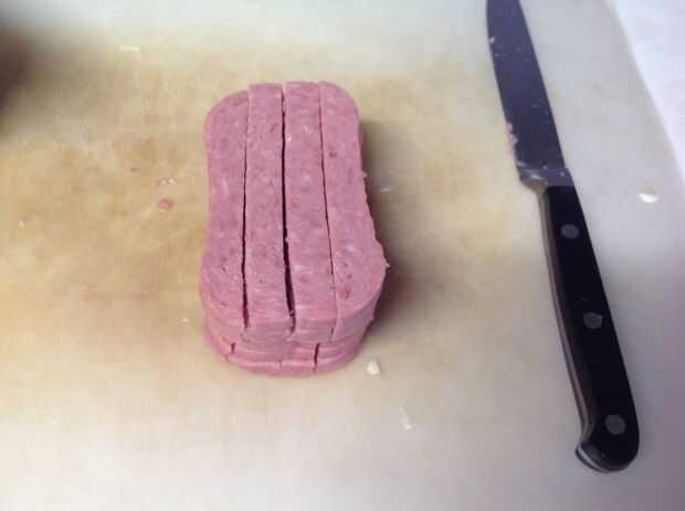 Usando sólo la mitad de la lata, corta el spam en seis trozos. Luego, cortarlo en cuatro veces. Luego cortar seis veces diagonalmente.