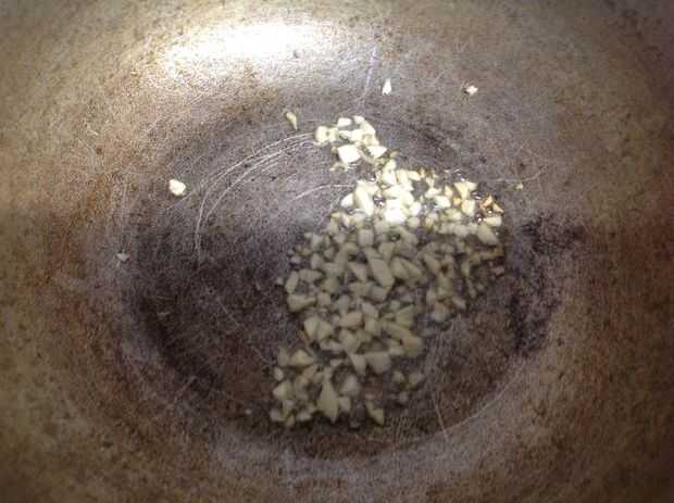 a fuego medio, añadir una cucharada de aceite en la olla y añadir los dientes de ajo picado en. Mezclar todo hasta que el ajo es marrón claro.