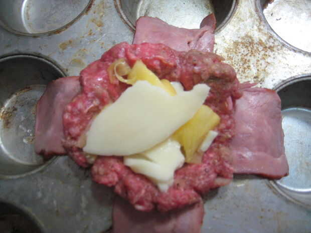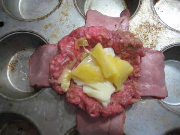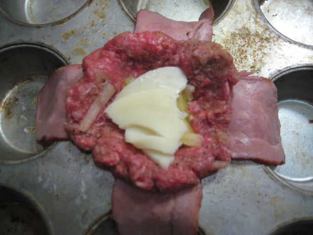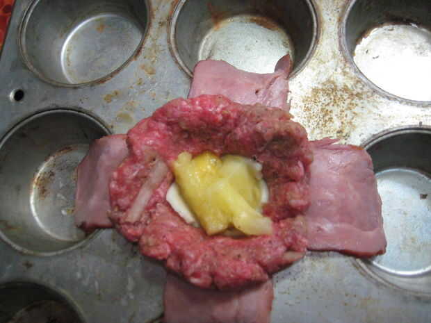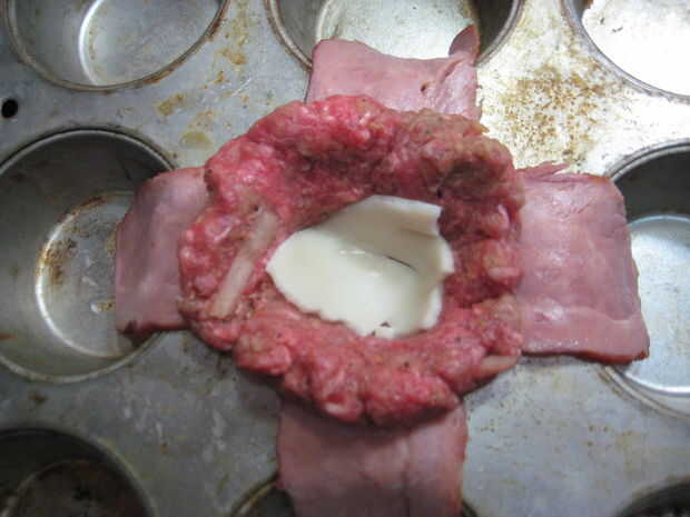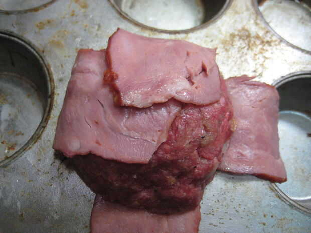 6. Coloque patty en su taza de tocino, luego empuje hacia abajo hasta que ajusta a la taza y tiene una cavidad de tamaño decente