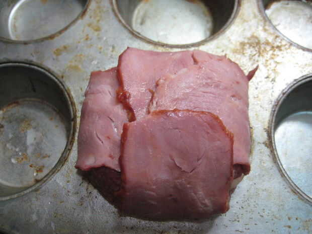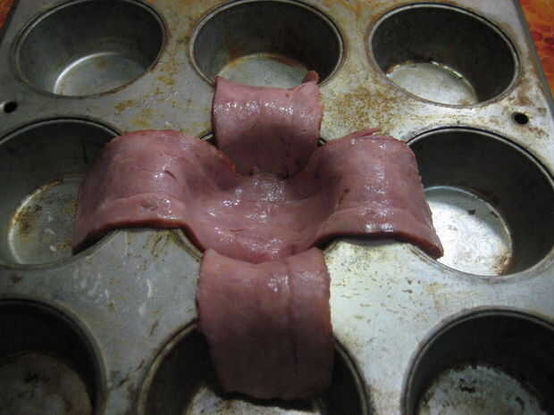 3. Coloque la tira de tocino uniformemente en el centro de una de las tazas de la bandeja de muffins.