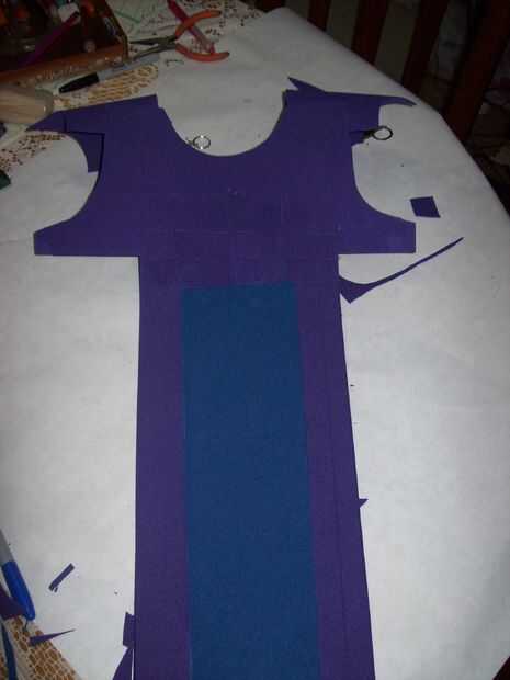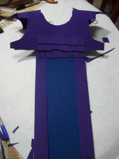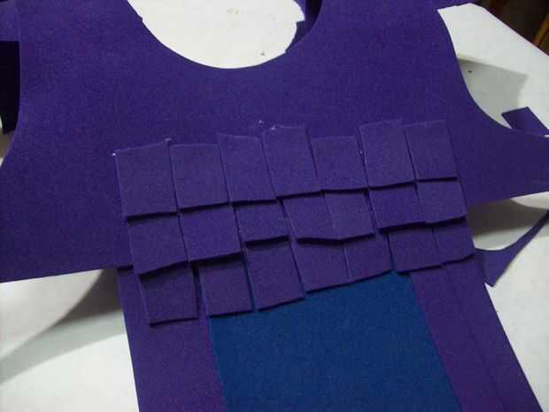 El hecho se hace enteramente de foamy. Empecé con un chaleco corto con algunas rayas corto simulando como plumas. El agregado dos franjas largas.