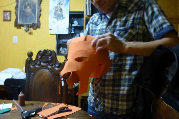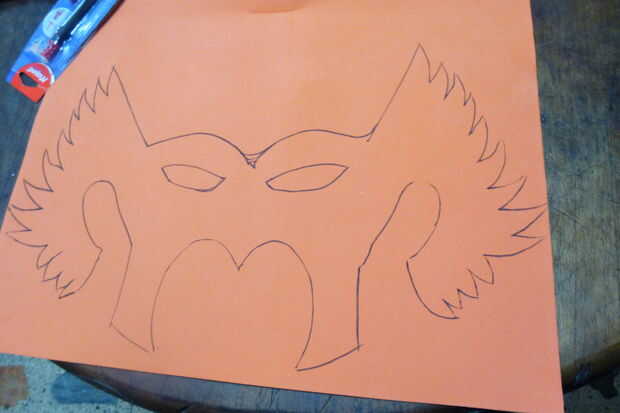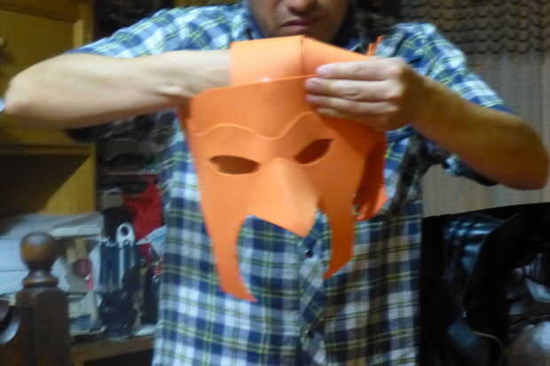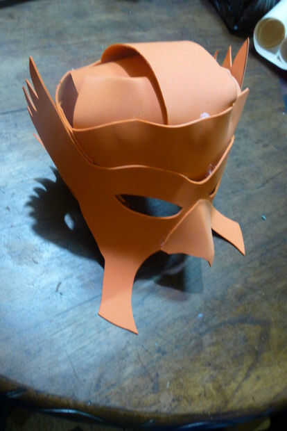 Trazar la forma de la máscara en una hoja de cartón, esto va a ser plantilla de te, en la naranja espumosa, luego corta hacia fuera y comienzo a encolarla y hacer la forma del casco.