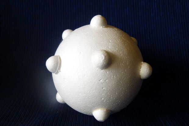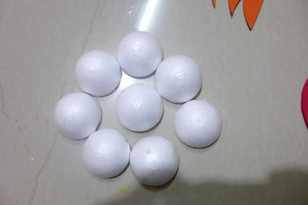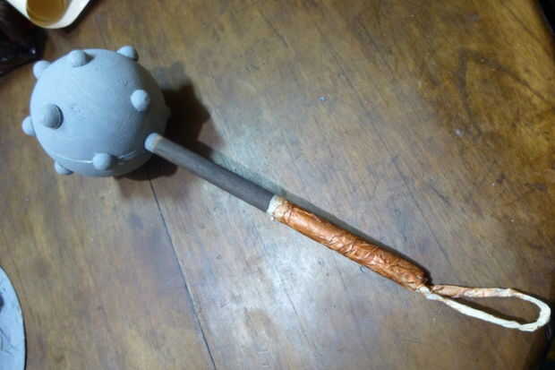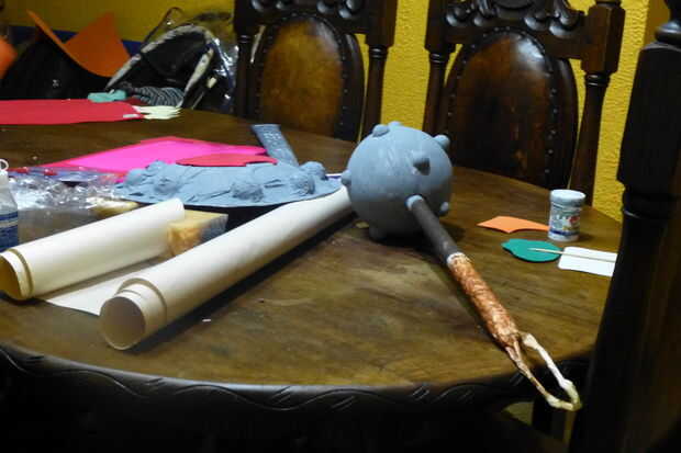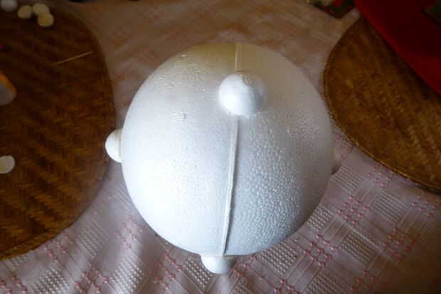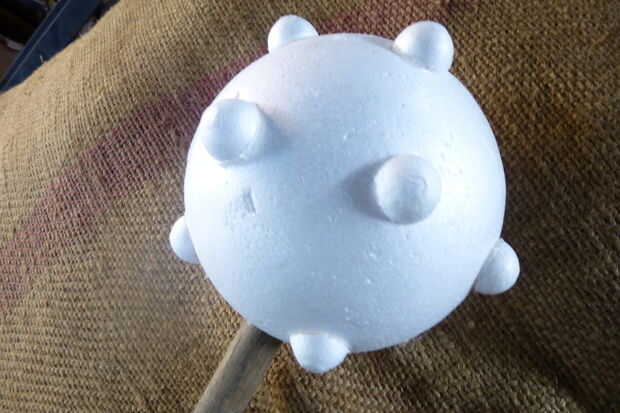 que utiliza una bola grande de unicel para la maza y 16 medias de bolitas de espuma de poliestireno. Solo pegamento alrededor de la bola, hacer un agujero detrás y pegar un pedazo de dovel, pintar en gris, dejarlo seco y ganas de romper.