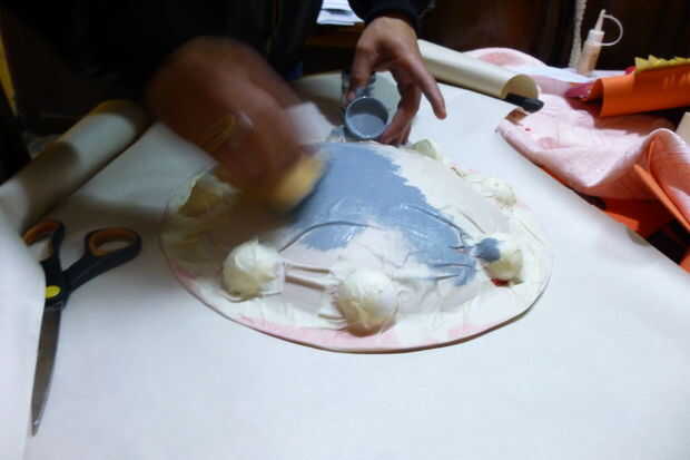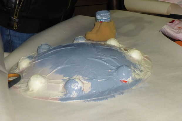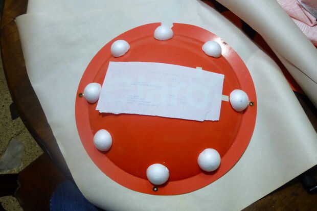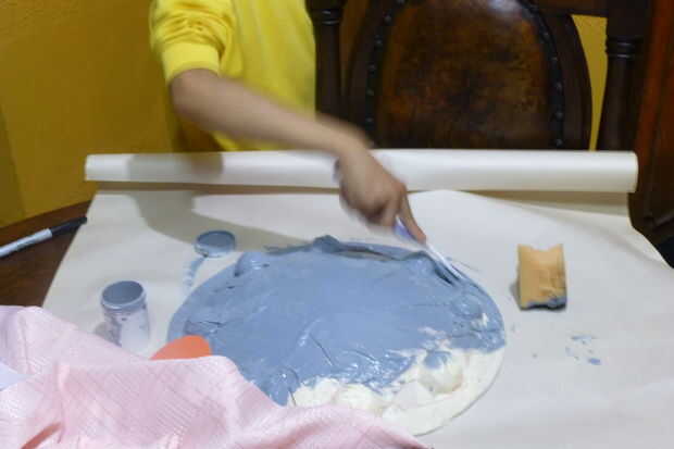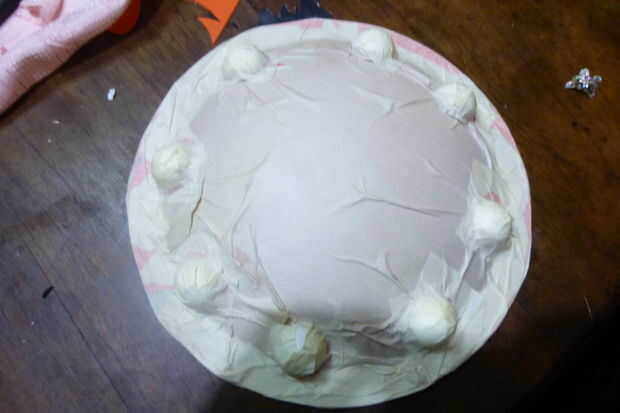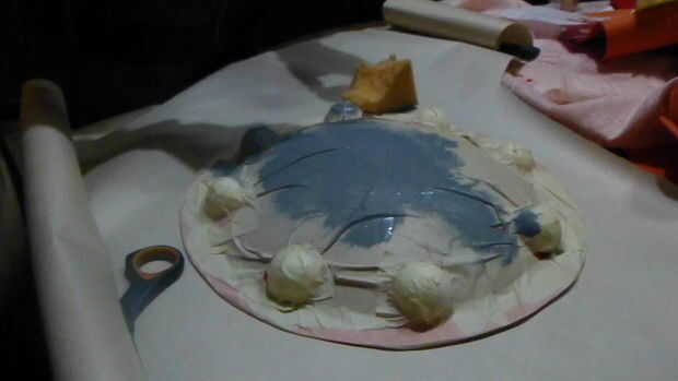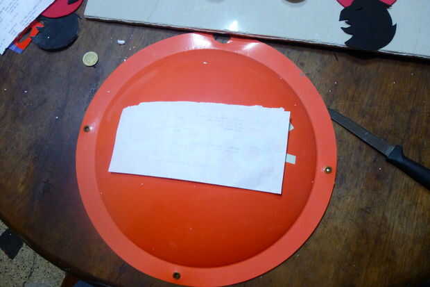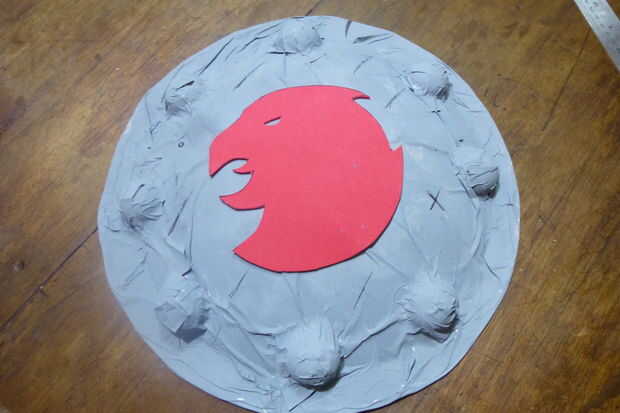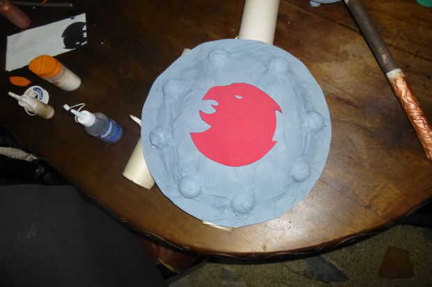 Para el escudo utiliza un tat de signo publicidad redondeado encontrado en una tienda, acabo cortado en bolas de espuma de poliestireno de mitades 4 y péguelo a la escudo, luego pegamento un pedazo de papel, cubriéndolo con máscara de cinta cubre el pequeño vals y hacer todos los detalles. Luego pinto todo en gris, porque that´s el color del metal Nh,