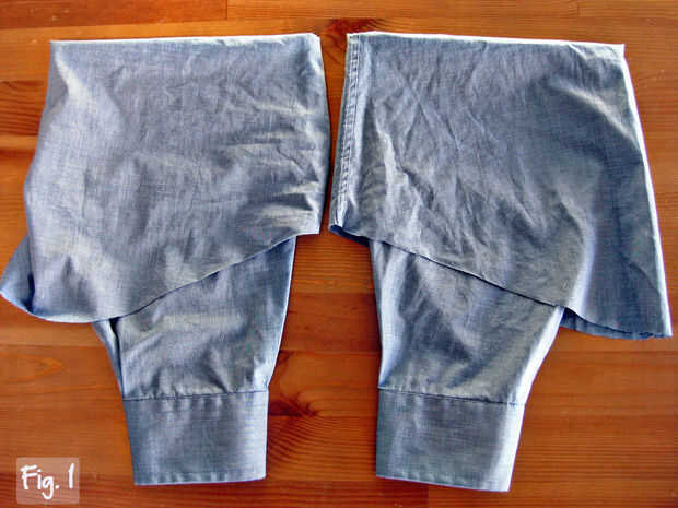 PIN una línea a través de la pierna de las bragas para marcar la longitud que desea para el pantalón. Algunas personas prefieren usar un lápiz de la tela, pero me gustaria ver lo que estoy haciendo mientras manipula el material - que utilizar pernos. Hacer esto para ambas mangas (ver fig. 2)