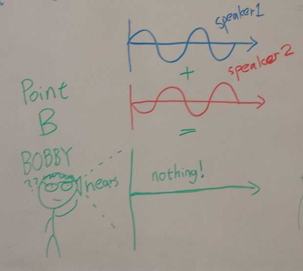 Bueno, casi nada. En la práctica, las ondas de sonido será redirigidas y rebotó en un montón de cosas antes de llegar a su oído, y las ondas de sonido de los altavoces 1 y 2 seguramente no sería la misma amplitud cuando llegaron que así cancelación perfecta no sucede en el mundo real. Además, la gente tiene dos orejas, no uno! Pero incluso en la vida real, Angela le grita probablemente a Bobby que ella no podía oír nada sobre el ruido horrible, y Bobby sería confundido desde que apenas estaba oyendo nada de los dos altavoces.
