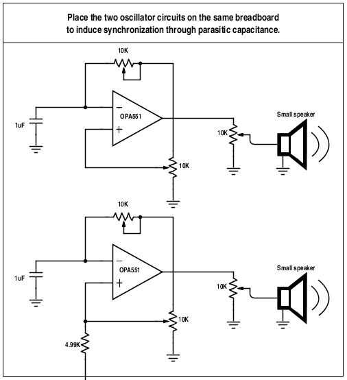 Asegúrate de construir los circuitos de oscilador de dos en el mismo tablero. Capacitancia parásita hará que los osciladores sincronizar a unos con otros y bloqueo juntos, haciéndolo más fácil para usted sintonizar los dos osciladores para generar la misma frecuencia de las señales. La segunda imagen de arriba muestra la medición de las salidas de los osciladores (del oscilliscope está midiendo voltaje en la salida de los amplificadores de dos de la op). En la imagen, las ondas cuadradas son la misma frecuencia y se traban fuera de fase. Usted podrá oír claramente este bloqueo se producen una vez que has ajustado los dos osciladores para la misma frecuencia. Trate de hacerlo para probar sus osciladores.