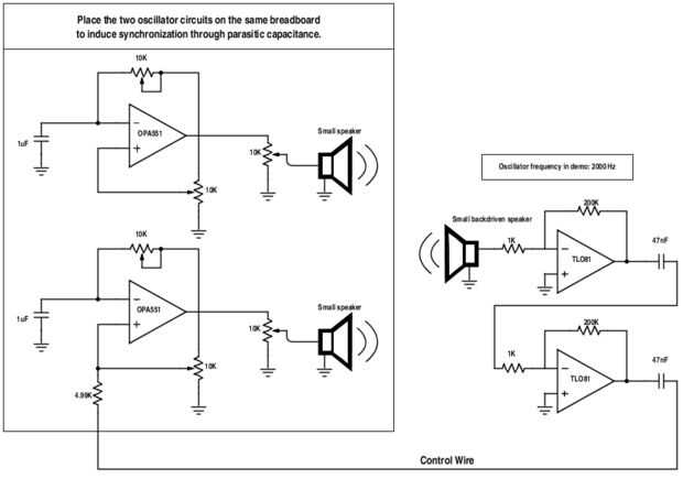Conectar los osciladores y controladores con el control de cable en el diagrama que se muestra arriba, y debe comenzar a ver interferencia destructiva, donde el micrófono (backdriven altavoz) es! Para nuestra demostración, hemos afinado los osciladores para generar ondas cuadradas de 2KHz, y el control funcionó mientras el controlador se mantuvo dentro del rango de un pie o dos. Usted debe ver que mueve el controlador cambiará poco a poco la fase compensada entre el generado ondas cuadradas si alcance en las salidas de los osciladores. Echar un vistazo a la demo de video para ver en acción!