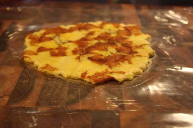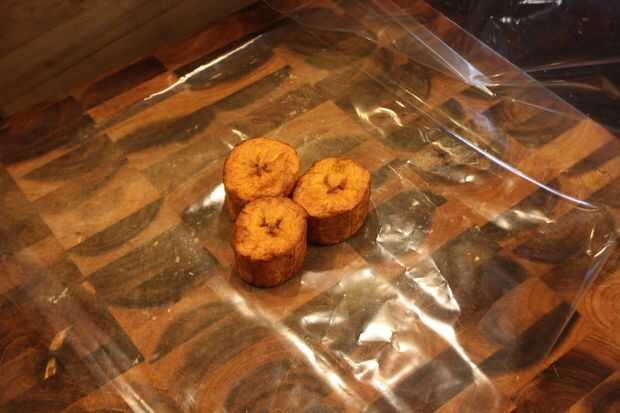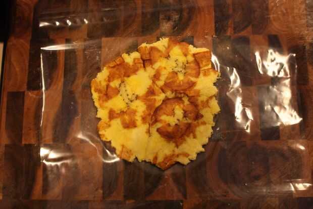 Si intentar el esquivo patrón personal tres cepas (ver paso anterior), las cepas deben ser cálidas para aplanarlos. Sin embargo, casi siempre es más fácil romper cuando caliente, independientemente de la forma deseada. 4. Coloque el tocón frito entre la bolsa de plástico, y asegúrese de que está tendido y cubierto por el plástico. Tome la segunda bandeja de tablero pesado y romper el muñón de plátano. El grueso es un tema de debate y preferencias personales, pero yo diría que aspirar a un cuarto de pulgada.