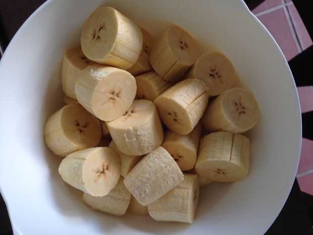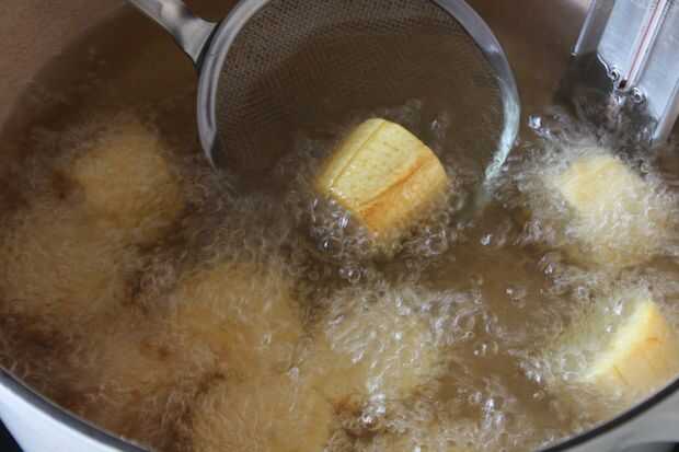 Si se usa plátano amarillento: calentar la olla y esperar hasta que el aceite alcanza los 325 F o menos. Freír los tocones para 8-10 minutos por tandas, hasta que se doren. Ver la foto de arriba. Una vez hecho esto, no tire aceite, que se utilizará más adelante en el paso 5, simplemente apaga el fuego.