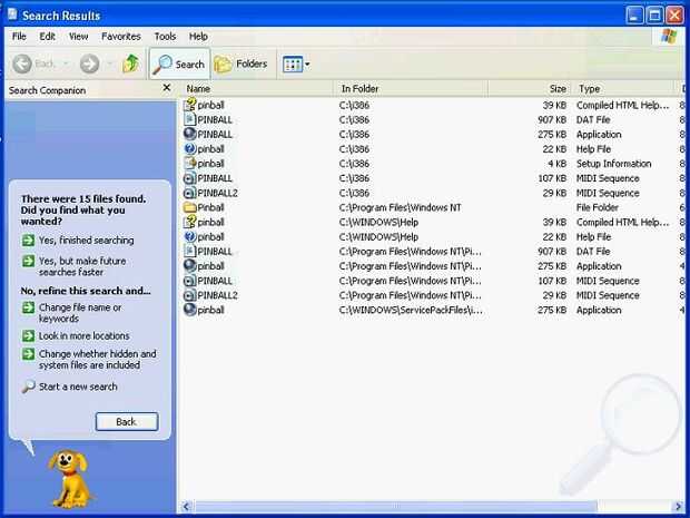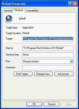 Para Windows XP y Windows 2000 Professional, la ruta exacta es C:\Program programa\Windows NT\Pinball. Esto probablemente es el mismo para Windows NT (4.0) también. La ruta puede o no puede ser diferente para sistemas operativos 9 x de Windows (incluye Windows ME). No sé, nunca he hecho esto en las versiones concretas para ello. De todos modos, hay varias otras maneras de encontrar la carpeta. Usar la búsqueda para encontrar "pinball", la carpeta se suba como uno de los resultados. También puede ir a la carpeta de juegos en la pestaña "todos los programas" del menú Inicio y buscar el icono de pinball. Lo haga y vaya a propiedades del acceso directo. Haga clic en "buscar destino" en la pestaña "acceso directo" y le llevará a la aplicación (.exe) dentro de la carpeta.
